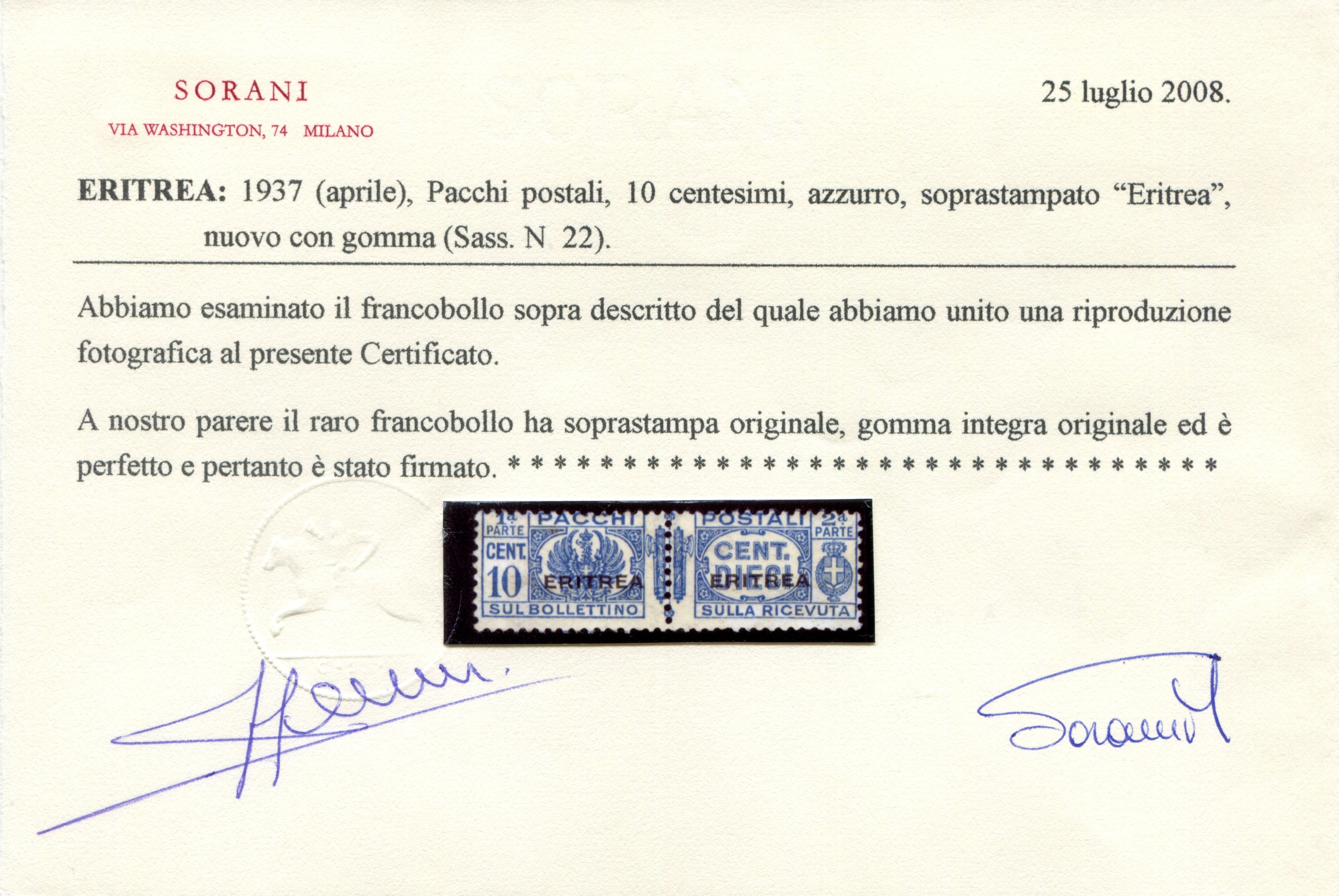 il raro valore della serie, nuovo gomma integra perfetto, cert. Sorani, Sassone 22 Euro 18.000,00