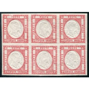 ampi margini, blocco splendido, un esemplare in basso con riga di colore completa in alto, i tre esemplari in alto con traccia di linguella e quelli in basso con gomma integra, cert. Colla, 21f+21fn Euro 9300,00