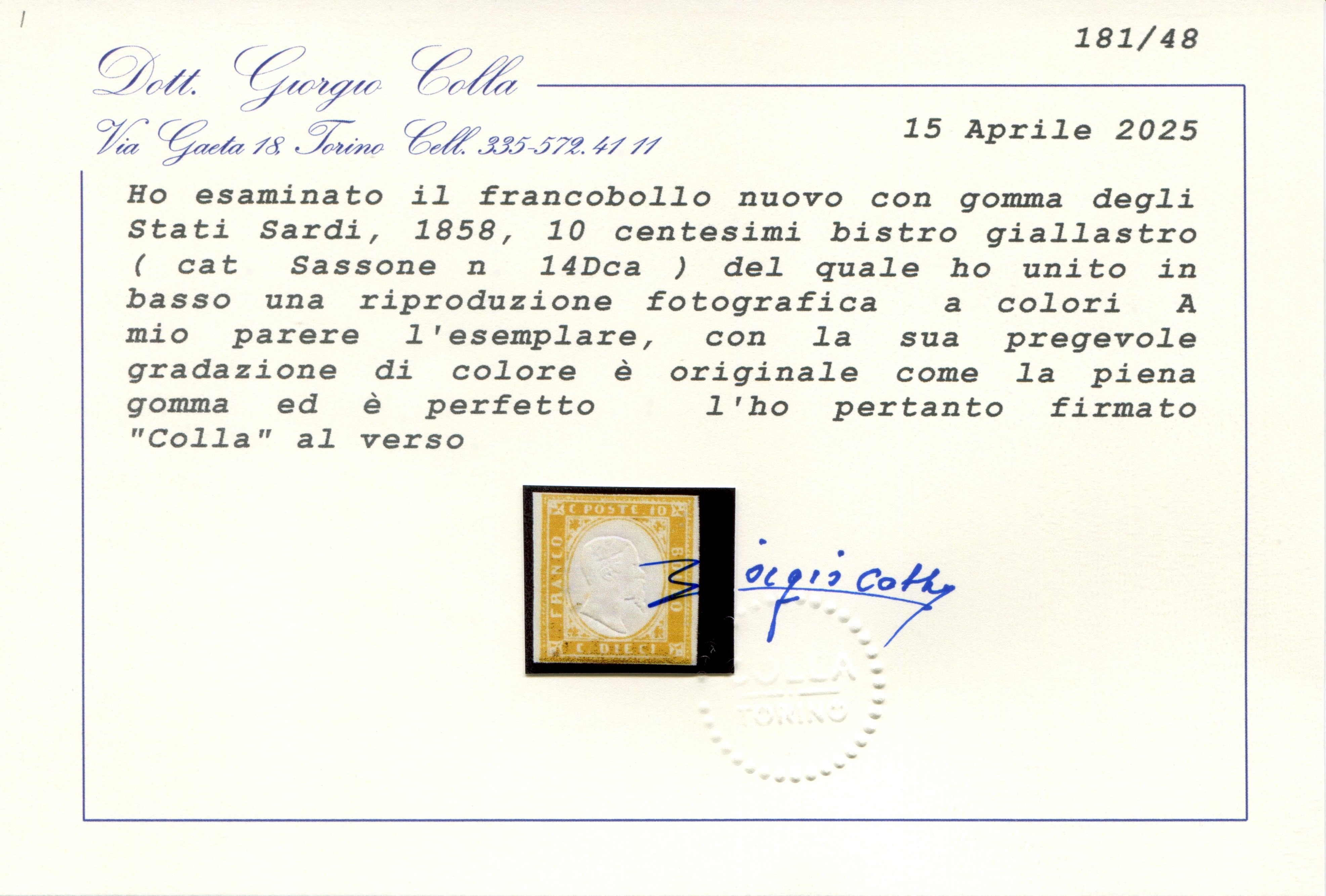 colore molto raro, nuovo gomma integra, con margini molto ampi verticali, a filo i due orizzontali, cert. Colla, Sassone 14Dca euro 11.000,00