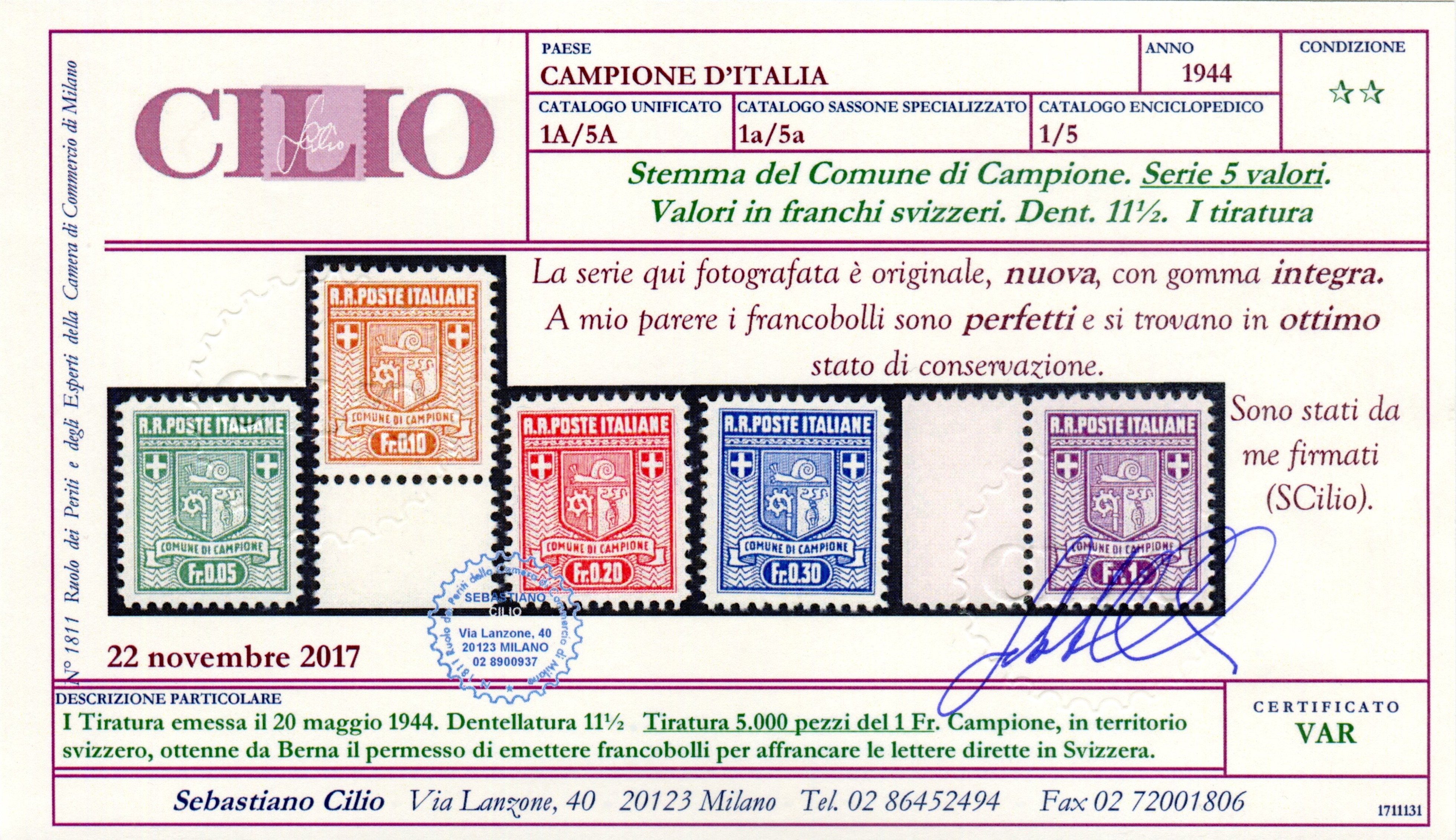 serie completa di 5 nuovi gomma integra, I tiratura, splendidi, non comune serie, cert. Cilio, 1a/5a Euro 3000,00