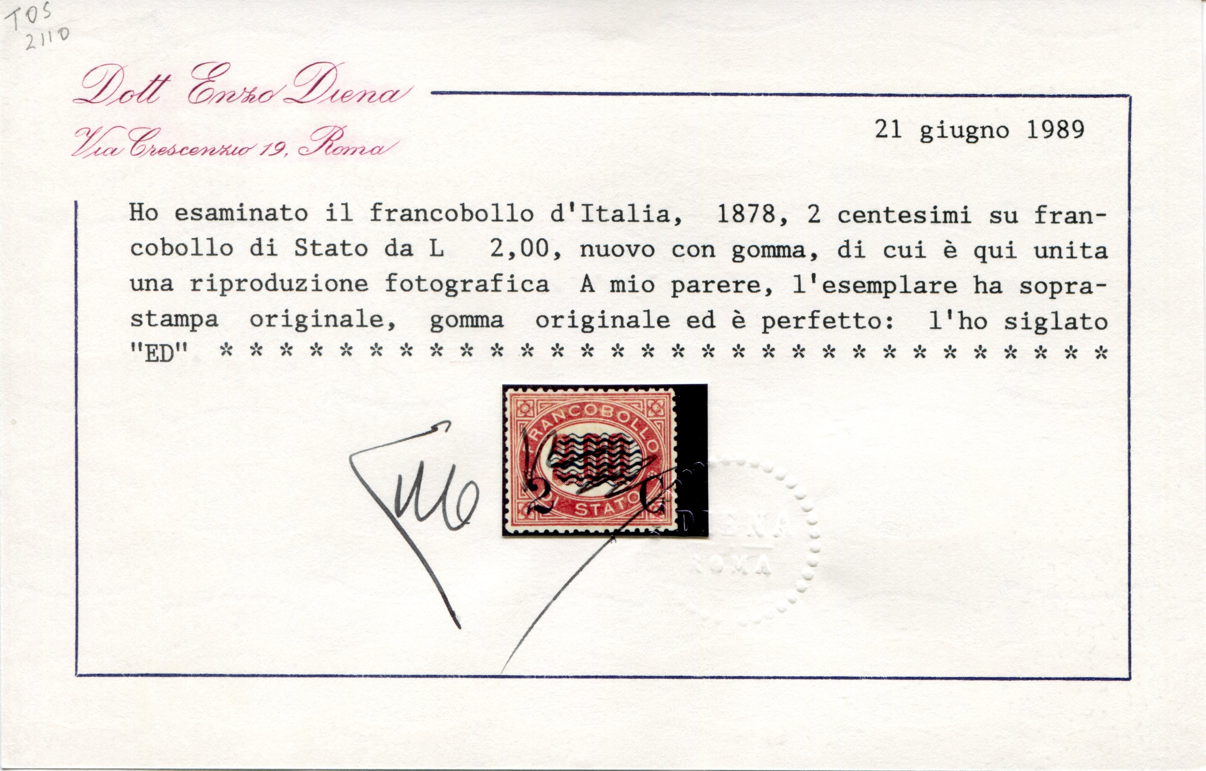 nuovo con traccia di linguella, molto fresco e di ottima centratura, cert. Ezo Diena, Sassone 34 Euro 2600,00