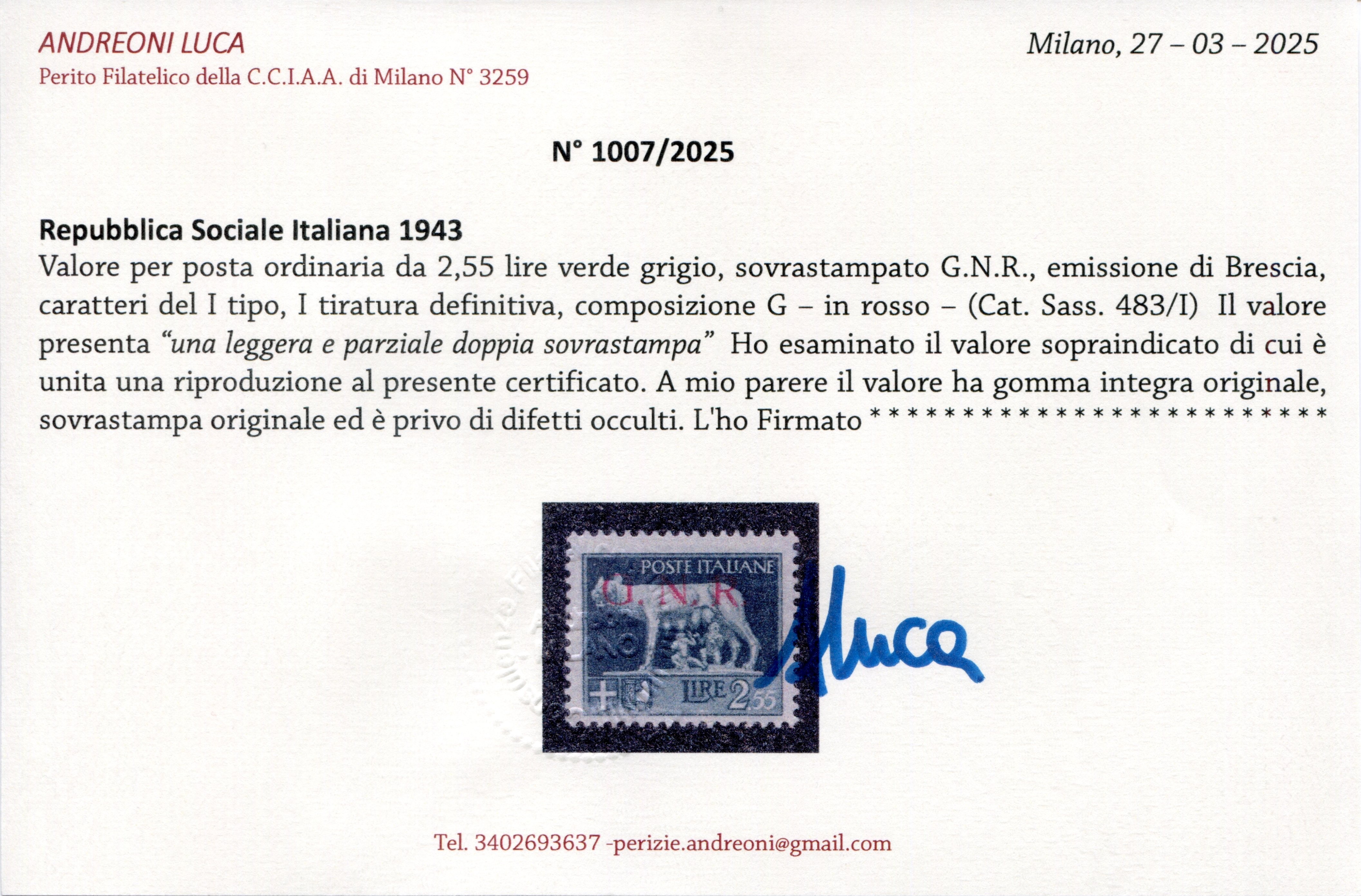 perfetto, gomma integra, raro e con parziale doppia stampa, cert. Andreoni, Sassone 483/I varietà Euro 500,00+