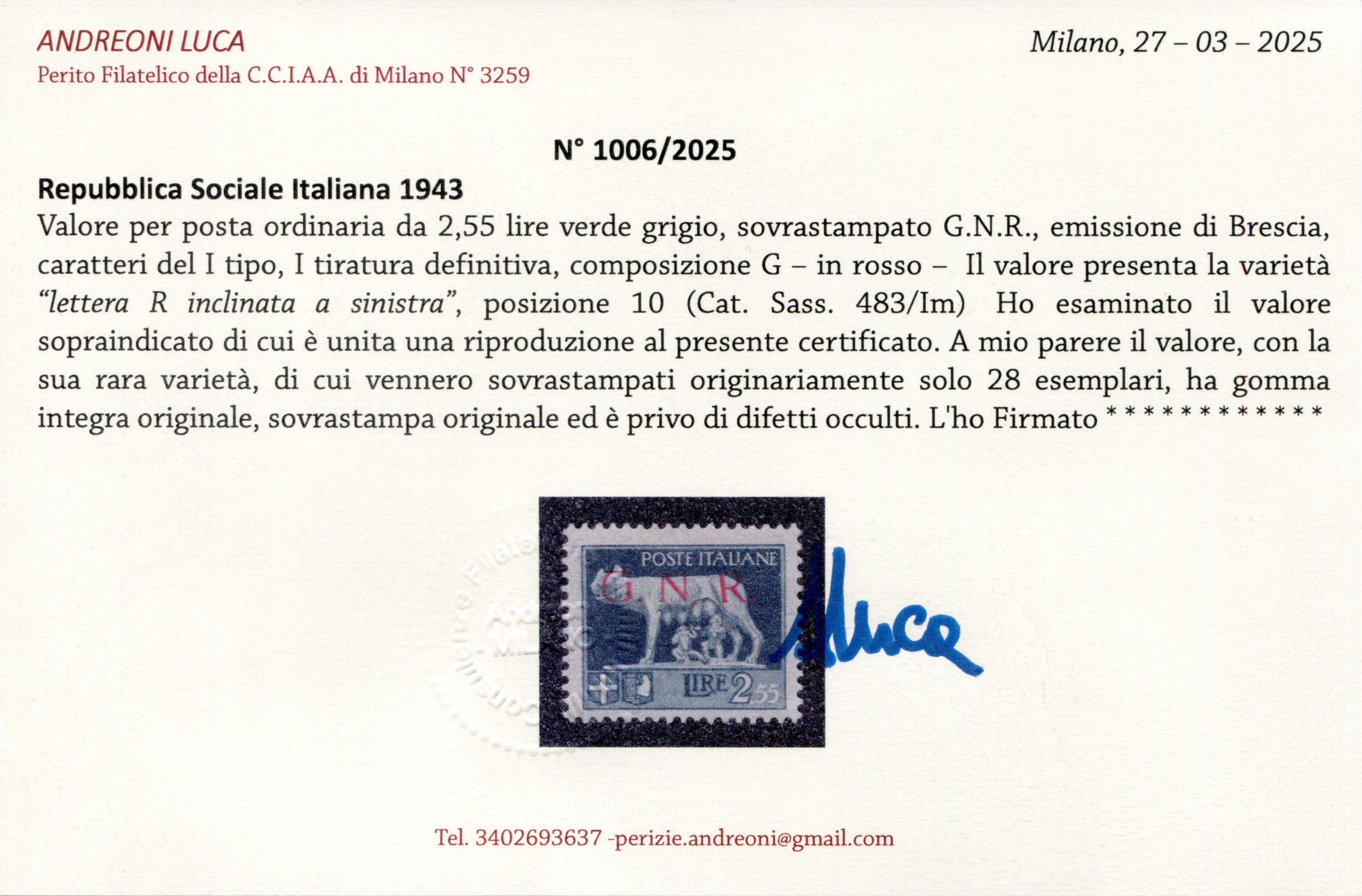 perfetto, gomma integra, raro solo 28 noti, posizione 10, cert. Andreoni, Sassone 483/Im Euro 8500,00