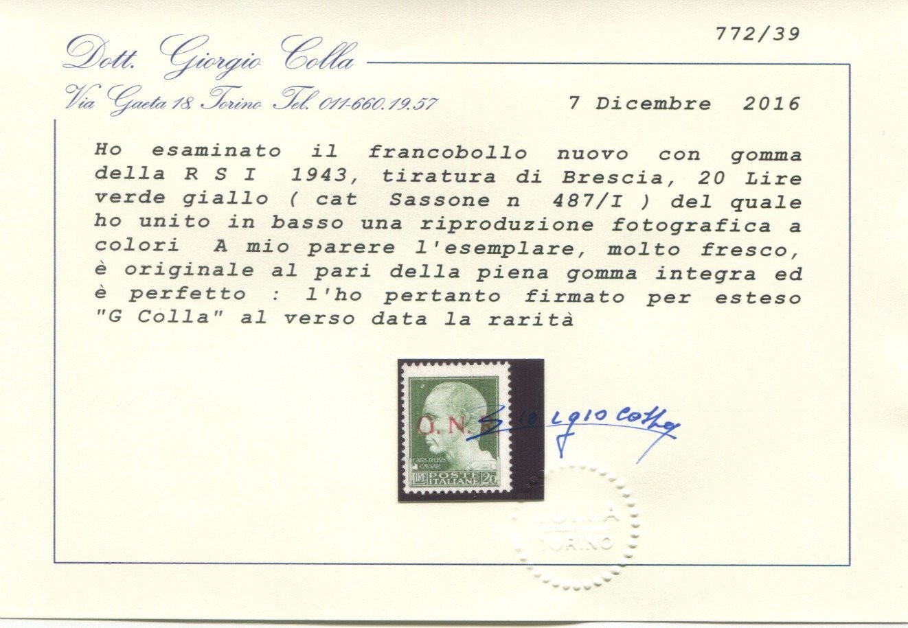perfetto, gomma integra, raro esemplare, siglato Sirotti, Fiecchi, cert. Colla, 487/I Euro 22.500,00
