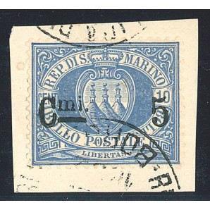 5 cent. su 10 oltremare, esemplare con centratura straordinaria, usato su piccolo frammento con annullo leggero, raro e di ottima qualità, tiratura di soli 150 esemplari, cert. Alberto Diena, Sassone 8A euro 20.000,00+