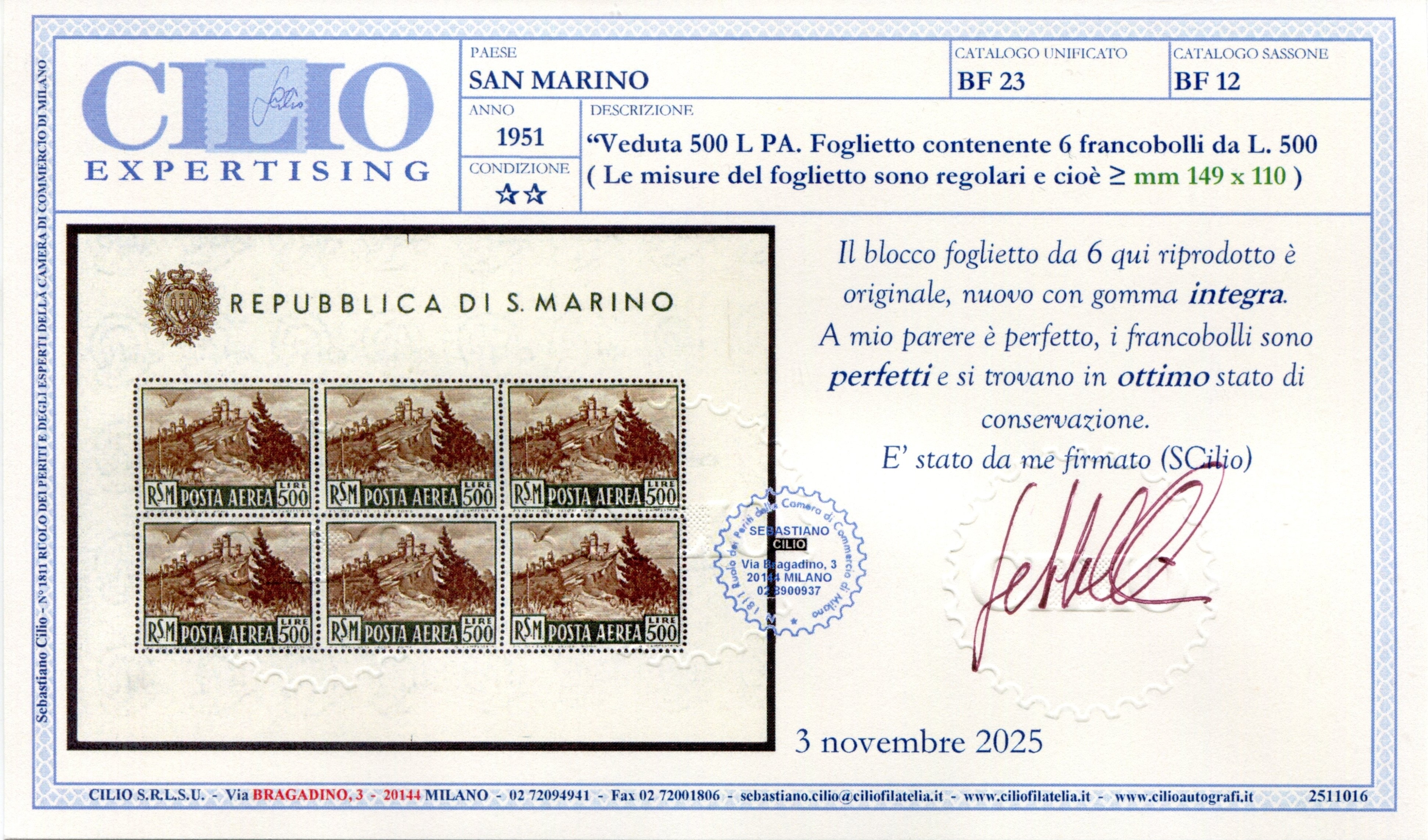 perfetto, nuovo con gomma integra, splendido, cert. Cilio, Sassone BF12 Euro 5500,00