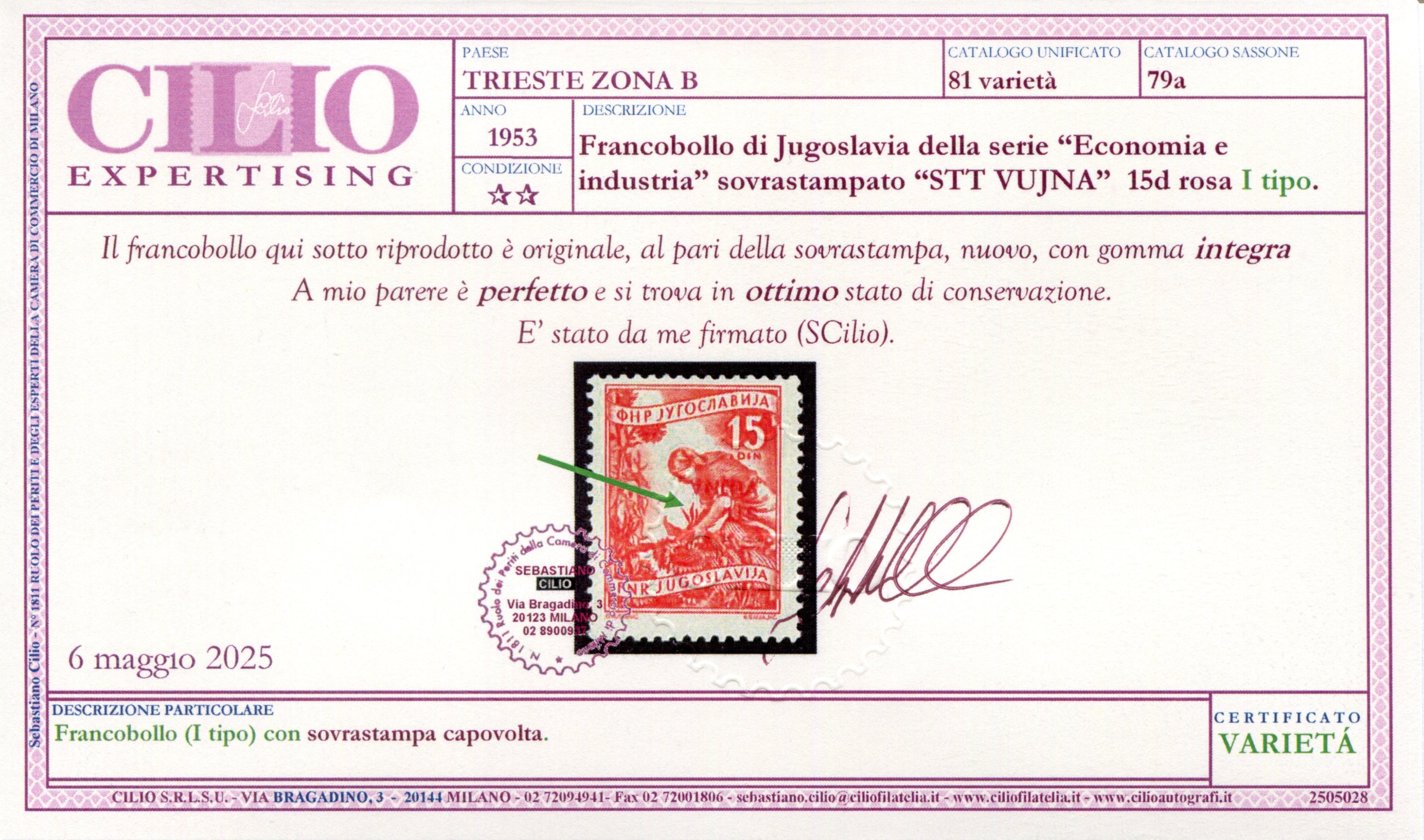 15 d I tipo, nuovo gomma integra, cert. Cilio, Sassone 79a Euro 1500,00