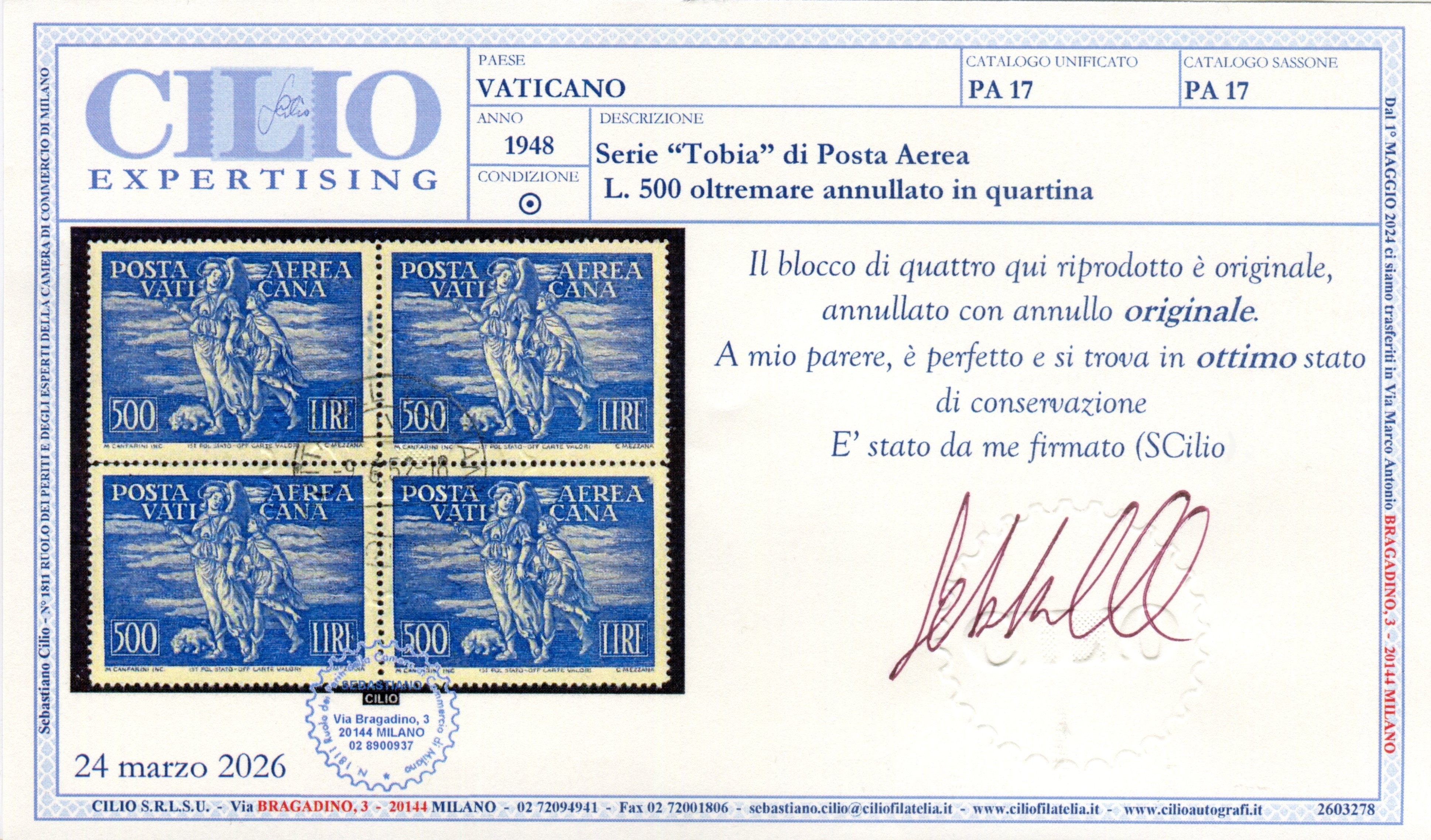 non comune blocco di 4, annullo leggero, ottima centratura, cert. Cilio, PA 17 Euro 2200,00+