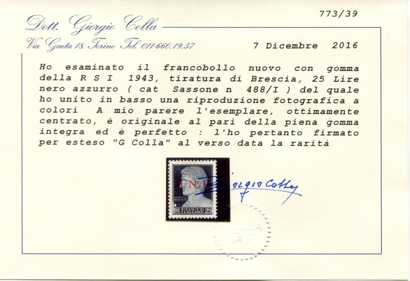 perfetto, gomma integra, raro esemplare, ben centrato, siglato Sirotti, Fiecchi, Bottacchi, cert. Colla, 488/I Euro 19.500,00