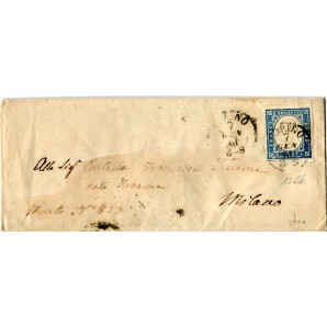 da Milano isolato su lettera completa con annullo di arrivo al verso, per Torino, 7 gen 1861, splendido e con margini enormi, Sassone 15Cb