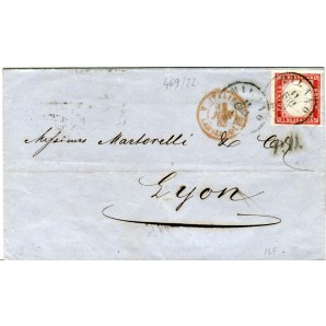 da Milano isolato su lettera completa con annullo di arrivo al verso, per Lione, 11 giu 1863, splendido e con margini enormi, Sassone 16F euro 240,00